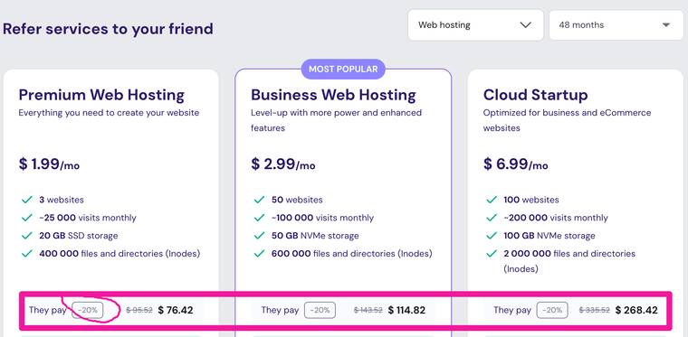 你可以使用 Hostinger 最便宜的计划,来创建25个网站,非常适合站长集群建站。不过,缺点也很明显:建成之后不能更换模板,与第三方各种 app 集成有限。深度了解 Hostinger AI 建站工具。